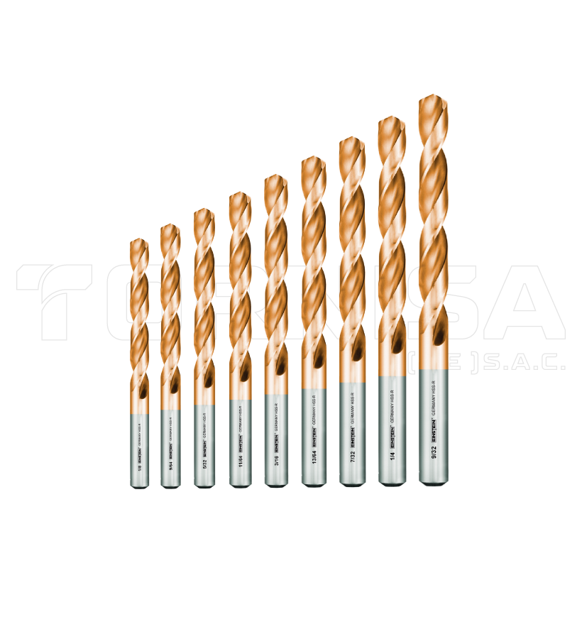Las brocas HSS-TiN (High-Speed Steel) DIN 338, especifica estas brocas incluyendo el diámetro, la longitud total, la longitud del filo y la forma de la punta de la broca.